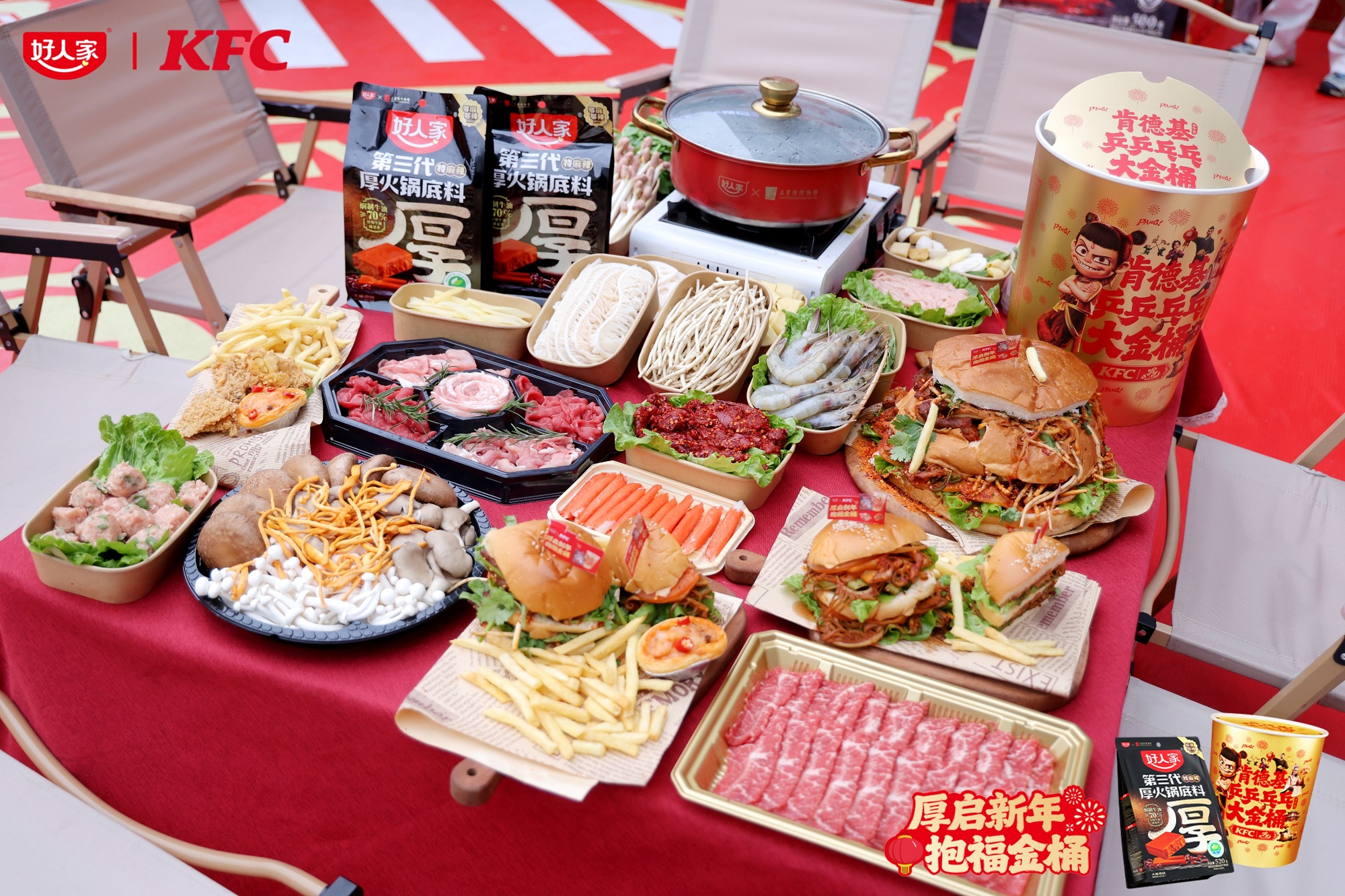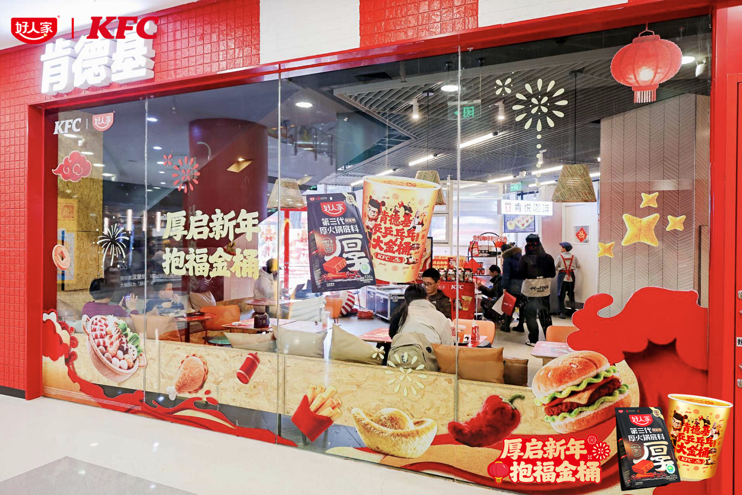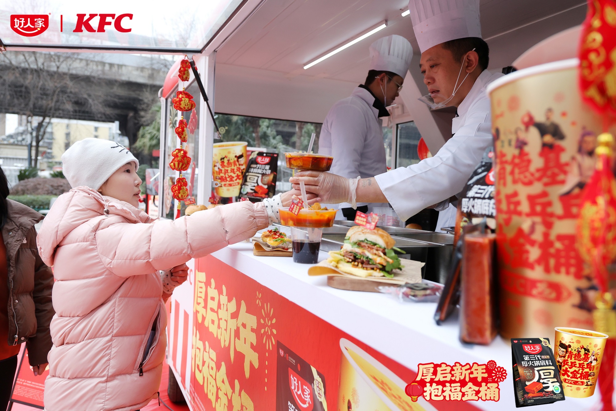 这场火出圈的中西混搭,源于复合调味料龙头品牌好人家与快餐巨头肯德基的跨界联动。双方推出的「厚启新年,抱福金桶」限时活动,将好人家的核心产品“厚火锅底料”与肯德基新春金桶相结合,用接“厚”运的美好寓意,精准回应了春节期间人们对“浓厚”风味与“浓厚”情感的追求,在熟悉的快餐空间里,创造了一种全新的年味记忆。