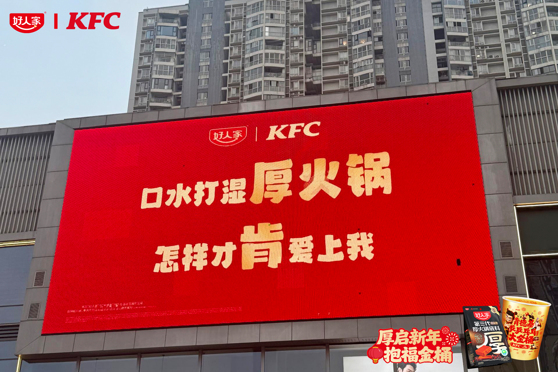 好人家此次跨界活动不仅在单点引爆,更实现了规模化落地、多方位渗透。2月2日-3月3日,四川省重庆市多家肯德基门店开启以「厚启新年,抱福金桶」为主题,持续进行“买金桶送火锅底料”联动活动,活动期间预计送出20万份好人家火锅底料产品,四川省重庆市的两家门店打造双品牌新春联名主题店,川渝区域所有万达广场大屏轮播好人家×肯德基新春联动广告,让更多人感受到双品牌联动的新春氛围。有效实现了品牌曝光的最大化,让好人家厚火锅底料走进更多家庭的新春餐桌。